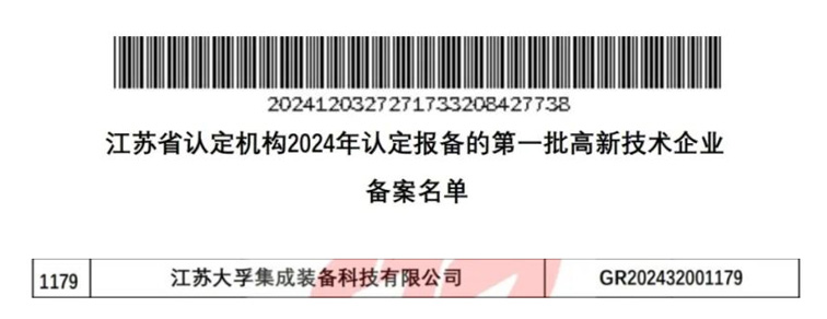 近日,全國高新技術企業認定管理工作領導小組辦公室發布《對江蘇省認定機構2024年認定報備的第一批高新技術企業進行備案的公示》。在這批公示名單中,江蘇大孚集成裝備科技有限公司榮膺在列,光榮上榜。