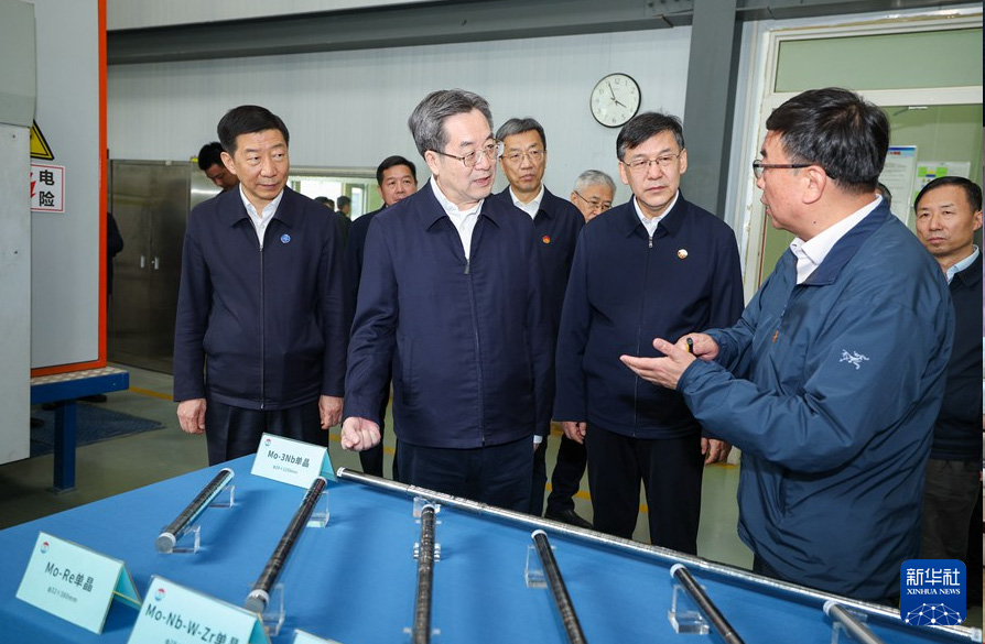 4月14日至16日,中共中央政治局常委、國務院副總理丁薛祥在陜西調研,并在西安主持召開座談會。這是4月15日,丁薛祥在西北有色金屬研究院,調研企業生產經營、產業轉型升級等情況。新華社記者 劉彬 攝